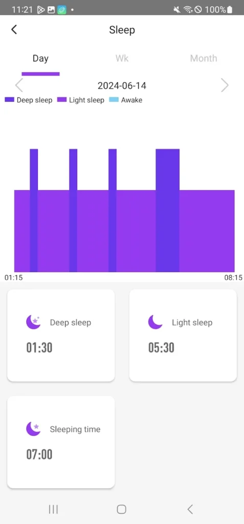 در قسمت پایش خواب نرم افزار Jring میزان خواب عمیق و خواب سبک و ساعت خوابیدن و بیدار شدن و کیفیت خواب قابل نمایش و اندازه گیری میباشد که این اطلاعات به صورت نمودار نمایش داده میشود و همچنین تاریخچه اطلاعات خواب به صورت روزانه و هفتگی و ماهانه ذخیره سازی میگردد.